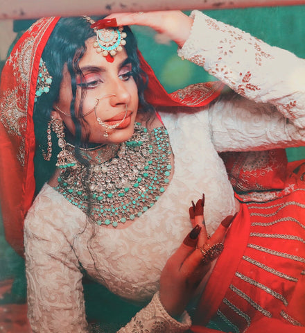 Aankita styles the Risha 2.0 Top with the Rosegold Classic MKJ 2.0 Skirt, lovely hair florals and her own jewels. She takes creamy white and pink floral tone influences from her favourite dessert, Kheer.